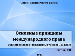 Документ описывает основные принципы международного права, его историю и формирование, включая такие аспекты, как суверенное равенство государств, невмешательство во внутренние дела и мирное разрешение споров. Принципы международного права закреплены в уставе ООН и других международных документах, а также отражены в законодательстве Республики Беларусь. Документ подчеркивает значимость соблюдения международных обязательств и сотрудничества между государствами.