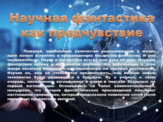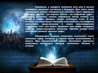 Документ рассматривает предсказания будущих технологий и социальных явлений, сделанные известными писателями, такими как Жюль Верн, Рэй Брэдбери, Герберт Уэллс и Роберт Хайнлайн. Эти авторы через свои литературные произведения предвидели появление многих современных изобретений, включая подводные лодки, космические полеты и мобильные телефоны. Их работы становятся не только основой жанра научной фантастики, но и важной частью культурного наследия, обращая внимание на потенциальные проблемы и возможности, связанные с развитием технологий.