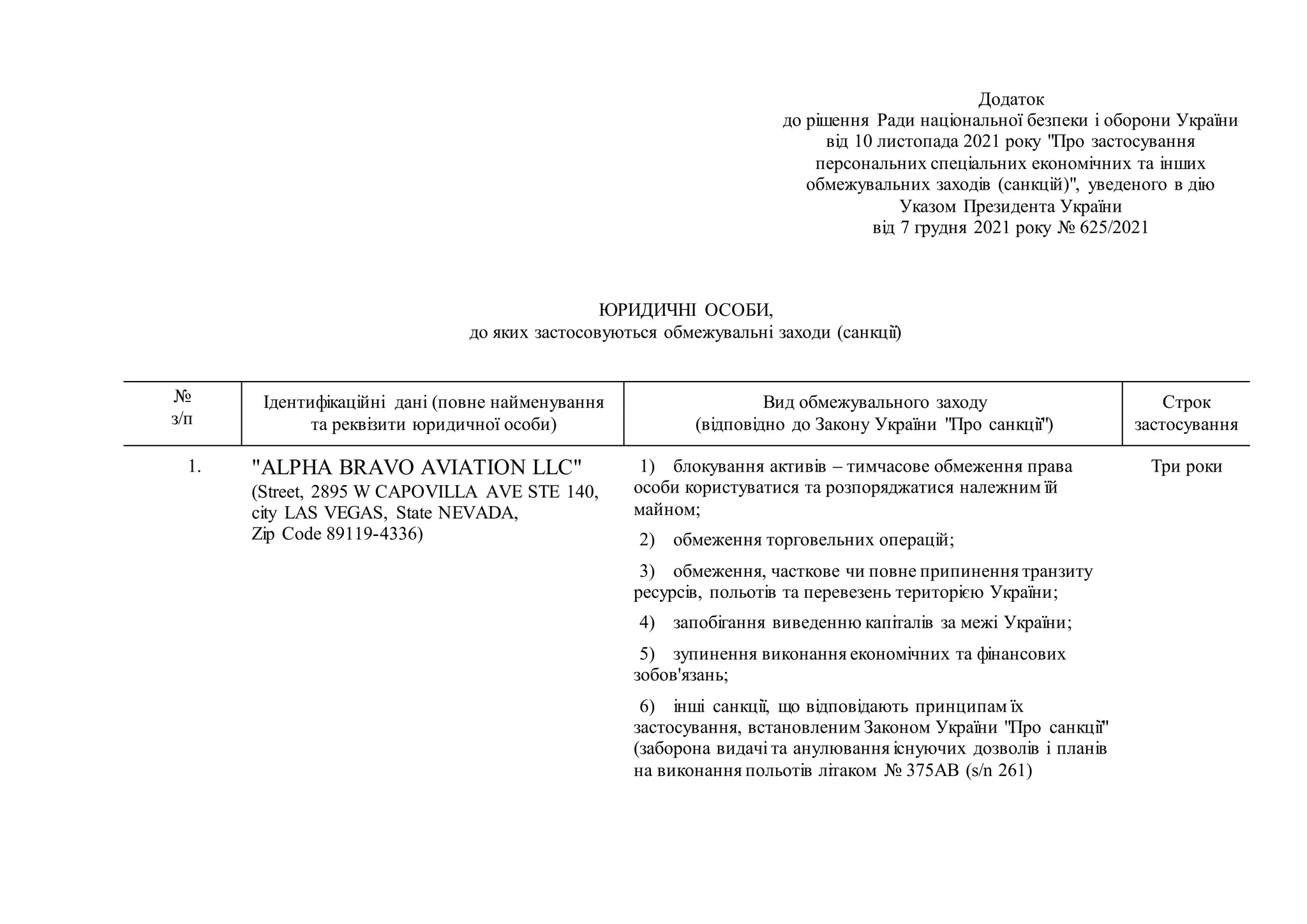 1) "ALPHA BRAVO AVIATION LLC" which will have its assets blocked, trade operations restricted, transit/flights over Ukraine restricted, capital movement restricted, and flight permits for aircraft 375AB revoked.