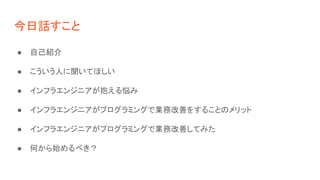 インフラエンジニアが抱える悩み ● インフラエンジニアがプログラミングで業務改善をすることのメリット ● インフラエンジニアがプログラミングで業務改善してみた ● 何から始めるべき?