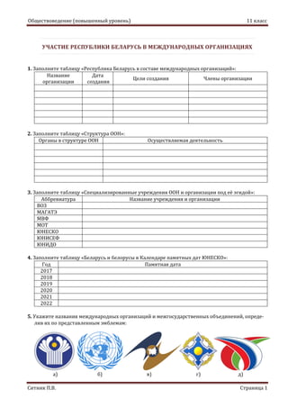 Документ посвящен участию Республики Беларусь в международных организациях и включает задания для студентов 11 класса по заполнению таблиц. Темы касаются структуры ООН, ее специализированных учреждений и календаря памятных дат ЮНЕСКО. Также представлены задания на распознавание международных организаций по эмблемам.