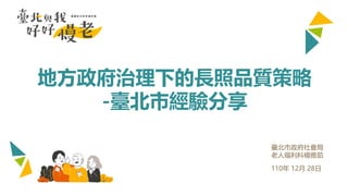 本文件分享了臺北市在應對長期照顧需求中的治理策略和服務現況,指出老年人口迅速增長,長照需求逐年上升。文中詳細介紹了居家服務及社區式服務的發展、服務品質管理機制,以及對老人福利政策的實施情況。透過數據分析和服務效果評估,呈現出對提升老人照顧質量的努力。