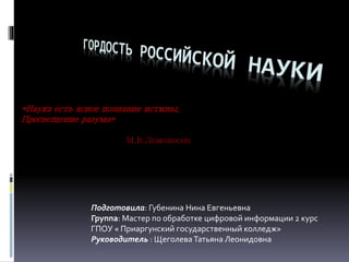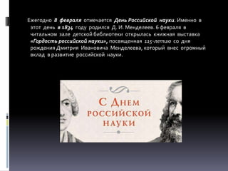 Документ посвящен Д. И. Менделееву, его жизни и вкладу в российскую науку, особенно в области химии. В нем описывается его учеба, научные достижения, включая открытие периодического закона и создание периодической таблицы элементов. Также упоминаются его личная жизнь и интересы, включая членство в научных обществах и учреждение наград в его честь.