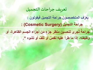 الوثيقة تركز على تعريف وأخلاقيات جراحة التجميل، موضحة أنها تهدف إلى تحسين المظهر أو تصحيح التشوهات. تتناول أيضًا الضوابط الشرعية والأخلاقية المصاحبة لممارسة هذا النوع من الجراحة. كما توضح المصطلحات المختلفة المرتبطة بالجراحة التجميلية وترتيبها في سياق الممارسة الطبية.