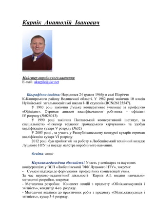 2012 році був прийнятий на роботу в Любешівський технічний коледж