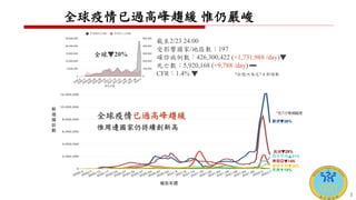 全球 COVID-19 疫情趋于缓和,但仍然严峻,台湾疫情稳定可控,近一周新增病例有所下降。为兼顾防疫与经济,台湾计划逐步放宽防疫措施,并缩短居家检疫时长。接种疫苗仍被视为防止重症与死亡的最佳方法,呼吁高风险群体继续接种。