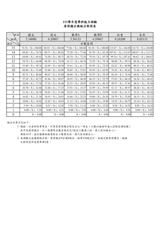 该文档提供了111学年度学科能力测验的分数与级分对照表,包括各科目的得分区间和对应级分的计算方式。文档详细列出了从0分到100分的级分分布,采用级分制评估考生成绩,并强调了细致计算与四舍五入的规则。总体来看,文档是对考试成绩的系统化整理和说明。