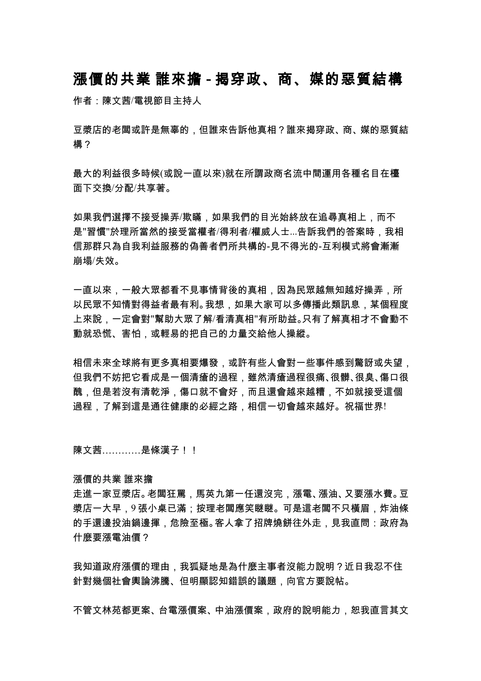 本文探讨了台湾政府与电力公司间复杂的财务危机和政策失误, highlighting的是“自由化”政策对台电造成的负面影响。作者呼吁公众关注真相,以免被操纵和欺瞒,从而促进社会的透明和健康发展。最终,作者强调揭露政、商、媒的不良结构对公众利益的重要性。