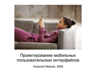 Документ рассматривает процесс проектирования мобильных пользовательских интерфейсов, акцентируя внимание на важности контекста использования и потребностях пользователей мобильных устройств. Он описывает различные этапы дизайна, начиная с исследования пользователей и заканчивая поддержкой разработки, и подчеркивает ограничения мобильной среды, такие как размер экрана и сложности ввода. Также рассматриваются особенности аудитории мобильных пользователей и задачи, которые они решают в контексте активного взаимодействия с окружающей средой.
