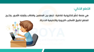 تتناول الوثيقة مفهوم التعليم الذكي وأدواته التفاعلية التي تعزز من مشاركة الطلاب في العملية التعليمية، مع التركيز على الأساليب الحديثة مثل الشاشات التفاعلية واستغلال البرامج الإلكترونية. كما تسلط الضوء على أهمية تبادل الأدوار بين المعلمين والطلاب، وتغطي بعض التقنيات والبرمجيات المستخدمة في هذا النوع من التعلم. تشير الوثيقة أيضًا إلى التحديات والسلبيات المرتبطة بالتعليم الذكي وكيفية تفاعل الطلاب والمعلمين مع هذه الأدوات.