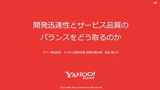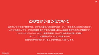Test Engineers Meetup 近年のソフトウエア開発では、ビジネス変化への対応がスピーディーで あることが求められます。いかに迅速にかつサービスの品質を落とさず にお客様へ新しい価値を提供できるかが重要です。 このプレゼンテーションでは、開発迅速性とサービスの品質の計測と可 視化、そして、2つの要素をバランスよく改善するべく自分たちが取り組 んでいることを事例として紹介します。