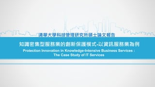 本研究探討知識密集型服務業的創新保護模式,以資訊服務業為案例,分析如何有效保護不同知識類型(商品知識、管理知識和顧客知識)。研究表明,除了正式的法律保護機制外,企業需結合非正式的推廣策略和品牌信任,以加強競爭優勢。此外,強調建立知識管理系統和企業文化以保存關鍵知識,並透過加值服務來建強顧客關係。