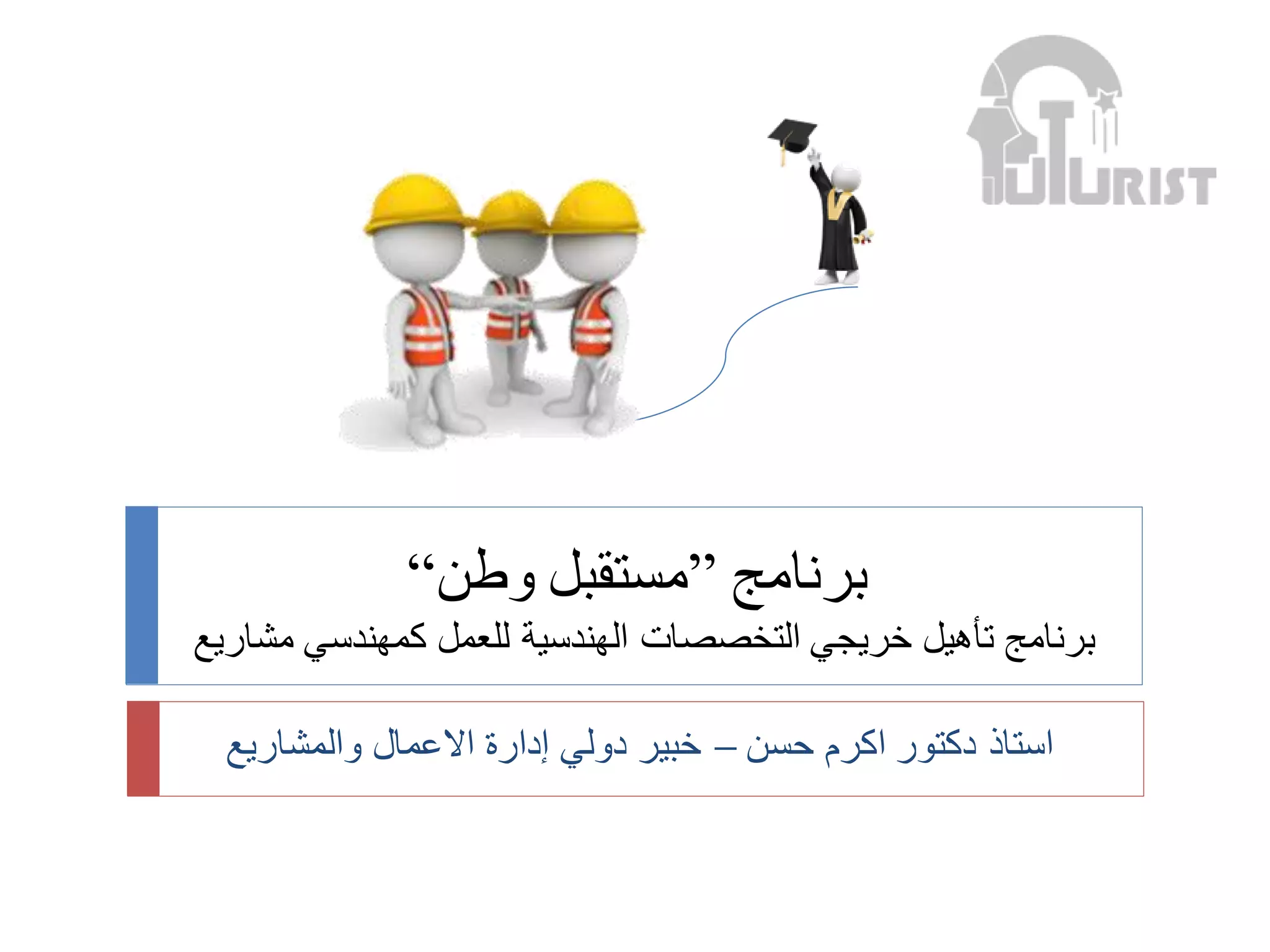 برنامج "مستقبل وطن" يهدف إلى تأهيل خريجي الهندسة من خلال توفير تدريب شامل ومشاريع عملية في إدارة الأعمال الهندسية. تشمل المسارات التدريبية إدارة المشروعات، جدولة الأعمال، وإدارة الجودة والمخاطر. يهدف البرنامج إلى تحقيق التنمية والنجاح بحلول عام 2030.