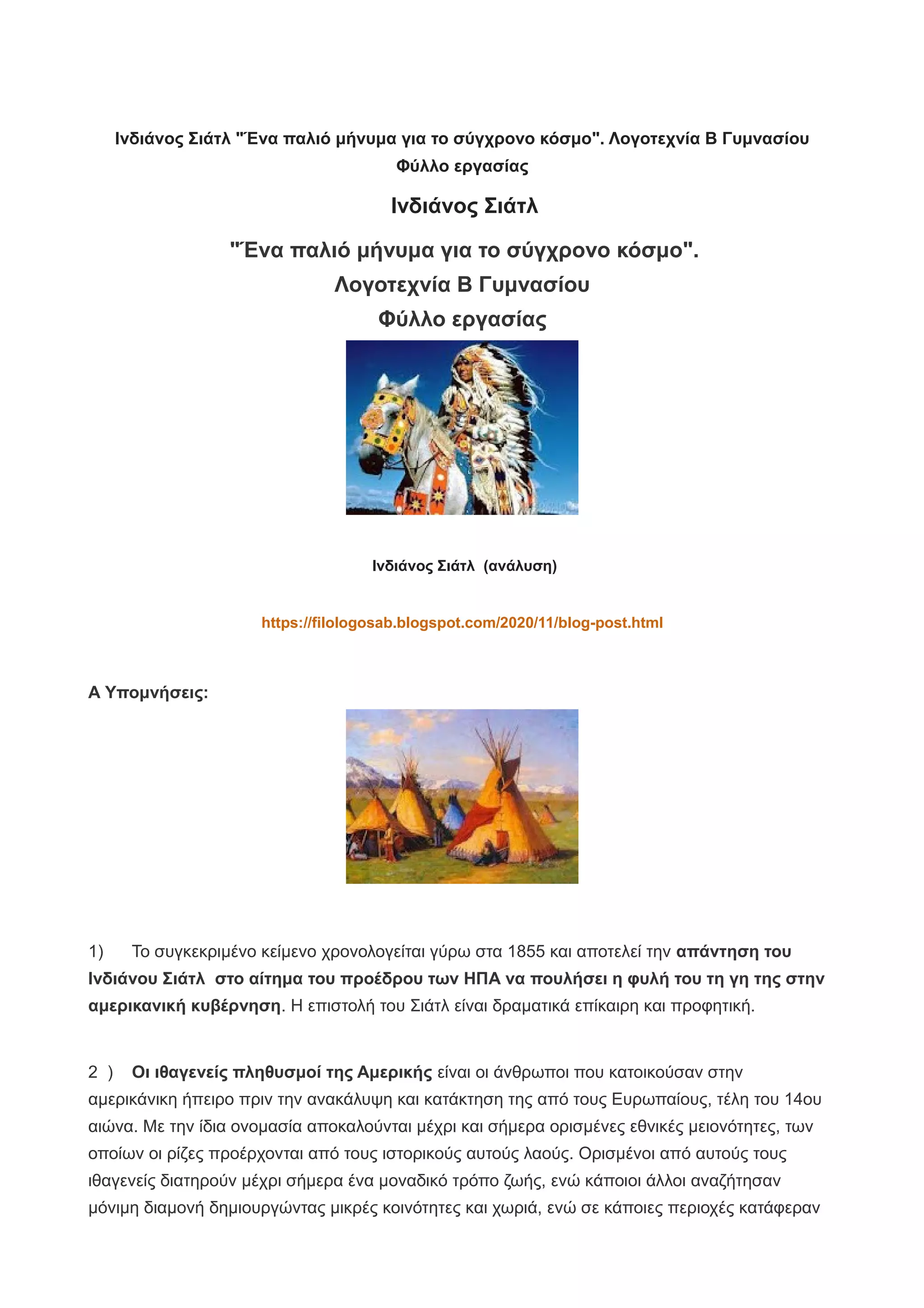 Ινδιάνος Σιάτλ "Ένα παλιό μήνυμα για το σύγχρονο κόσμο". Λογοτεχνία Β Γυμνασίου Φύλλο εργασίας