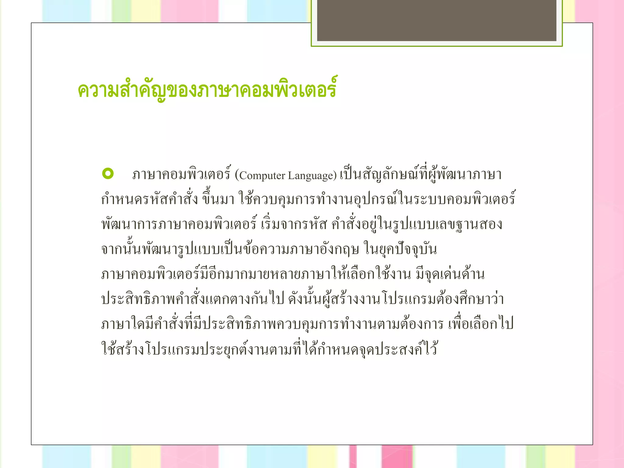 4.)การเลือกใช้ภาษาคอมพิวเตอร์ การสร้างโปรแกรมด้วยภาษาคอมพิวเตอร์