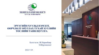 Similar to ЭРҮҮГИЙН ХУУЛЬД НЭМЭЛТ, ӨӨРЧЛӨЛТ ОРУУЛАХ ТУХАЙ ХУУЛИЙН ТӨСЛИЙН ТАНИЛЦУУЛГА