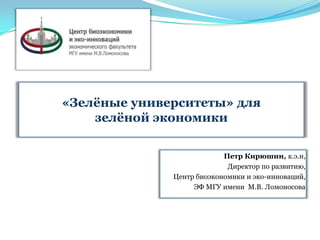 Документ обсуждает концепцию 'зелёных университетов' в России и их роль в формировании зелёной экономики. Основные задачи включают повышение экосознания среди студентов, внедрение эко-инноваций и интеграцию университетов с местными сообществами. Также рассматриваются примеры успешных инициатив и модели, которые могут быть адаптированы в российских вузах.