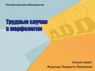 Документ содержит лекционный материал по трудным случаям в морфологии русского языка, охватывающий правила написания окончаний существительных, глаголов и прилагательных. Основное внимание уделяется определению падежей, склонений и спряжений, а также различениям в написании окончаний в зависимости от части речи. Есть рекомендации по выявлению ошибок и определению правильного написания в различных контекстах.
