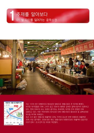 This document provides statistics on the growth and market share of Migros, Switzerland's largest retailer. It details that Migros grew from 13 stores in 1992 to 833 stores in 2012, increasing its market share from 11.8% to 27.3% in that period. The retailer dominates the Swiss grocery market and also owns banks and other business units. It is organized as a cooperative and aims to offer consumers high quality products at low prices.