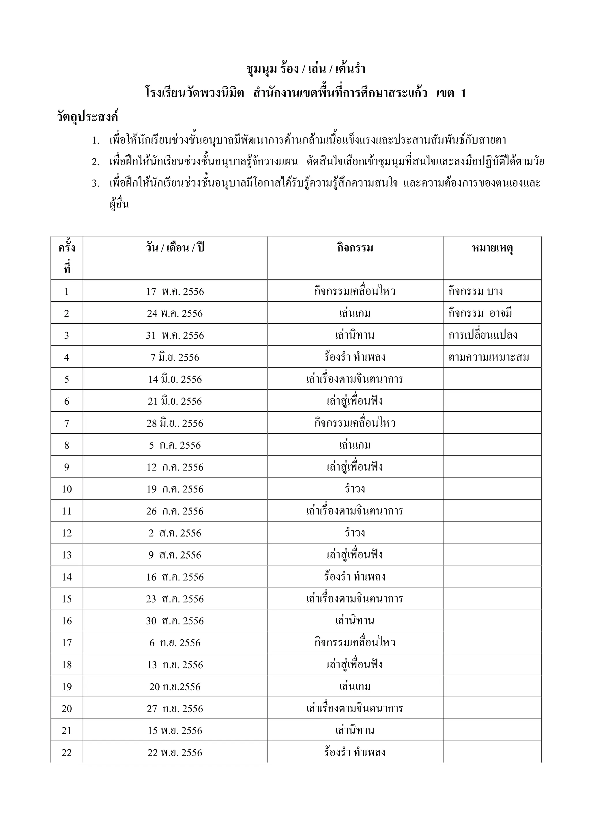 เลน / เตนรํา โรงเรียนวัดพวงนิมิต สํานักงานเขตพื้นที่การศึกษาสระแกว เขต 1 วัตถุประสงค 1. เพื่อใหนักเรียนชวงชั้นอนุบาลมีพัฒนาการดานกลามเนื้อแข็งแรงและประสานสัมพันธกับสายตา 2. เพื่อฝกใหนักเรียนชวงชั้นอนุบาลรูจักวางแผน ตัดสินใจเลือกเขาชุมนุมที่สนใจและลงมือปฏิบัติไดตามวัย 3. เพื่อฝกใหนักเรียนชวงชั้นอนุบาลมีโอกาสไดรับรูความรูสึกความสนใจ และความตองการของตนเองและ ผูอื่น ครั้ง ที่ วัน / เดือน / ป กิจกรรม หมายเหตุ 1 17 พ.ค. 2556 กิจกรรมเคลื่อนไหว กิจกรรม บาง 2 24 พ.ค. 2556 เลนเกม กิจกรรม อาจมี 3 31 พ.ค. 2556 เลานิทาน การเปลี่ยนแปลง 4 7 มิ.ย. 2556 รองรํา ทําเพลง ตามความเหมาะสม 5 14 มิ.ย. 2556 เลาเรื่องตามจินตนาการ 6 21 มิ.ย. 2556 เลาสูเพื่อนฟง 7 28 มิ.ย.. 2556 กิจกรรมเคลื่อนไหว 8 5 ก.ค. 2556 เลนเกม 9 12 ก.ค. 2556 เลาสูเพื่อนฟง 10 19 ก.ค. 2556 รําวง 11 26 ก.ค. 2556 เลาเรื่องตามจินตนาการ 12 2 ส.ค. 2556 รําวง 13 9 ส.ค. 2556 เลาสูเพื่อนฟง 14 16 ส.ค. 2556 รองรํา ทําเพลง 15 23 ส.ค. 2556 เลาเรื่องตามจินตนาการ 16 30 ส.ค. 2556 เลานิทาน 17 6 ก.ย. 2556 กิจกรรมเคลื่อนไหว 18 13 ก.ย. 2556 เลาสูเพื่อนฟง 19 20 ก.ย.2556 เลนเกม 20 27 ก.ย. 2556 เลาเรื่องตามจินตนาการ 21 15 พ.ย. 2556 เลานิทาน 22 22 พ.ย. 2556 รองรํา ทําเพลง