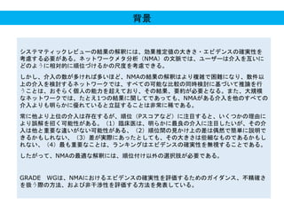 多数の介入がある複雑なネットワークメタ分析の結果より、介入の効果の程度をエビデンスの確実性を考慮して評価する手順(部分コンテキスト化)