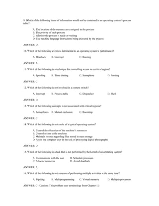 The document contains a test bank with multiple choice and fill-in-the-blank questions about operating system components and concepts such as processes, memory management, file management, device drivers, scheduling, and multitasking. It tests knowledge of the roles of different operating system parts like the file manager, memory manager, and dispatcher. It also covers topics like critical regions, mutual exclusion, deadlock conditions, and real-time processing.