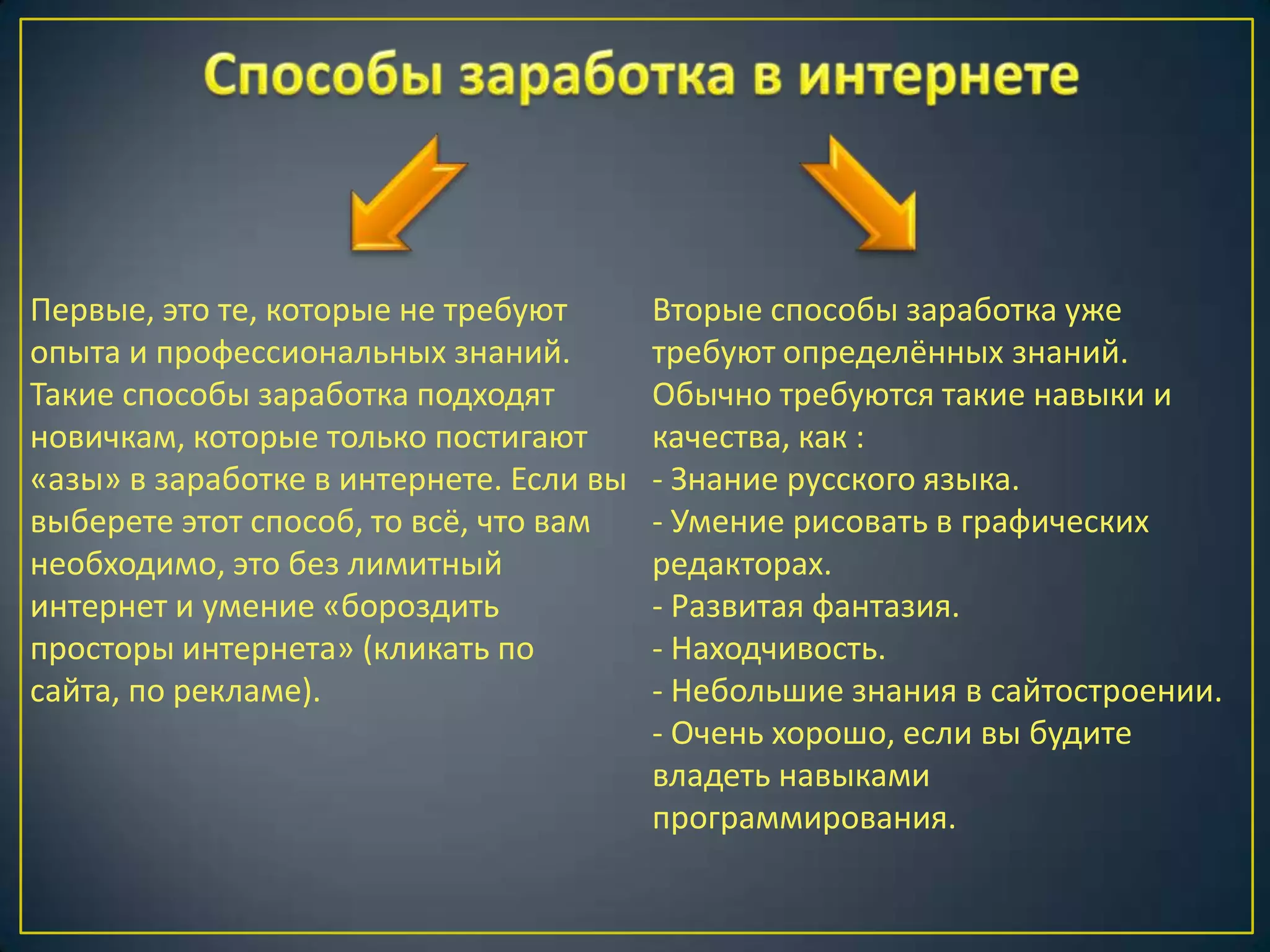 Документ описывает различные способы заработка в интернете, включая простые методы для новичков и более сложные варианты, требующие определённых навыков. Упоминаются способы заработка на кликах, рекламе, файлах и капче, с акцентом на знания в сайтостроении и SEO. Основное внимание уделено тому, что для успешного заработка необходимо развивать определенные навыки и использовать доступные онлайн-ресурсы.