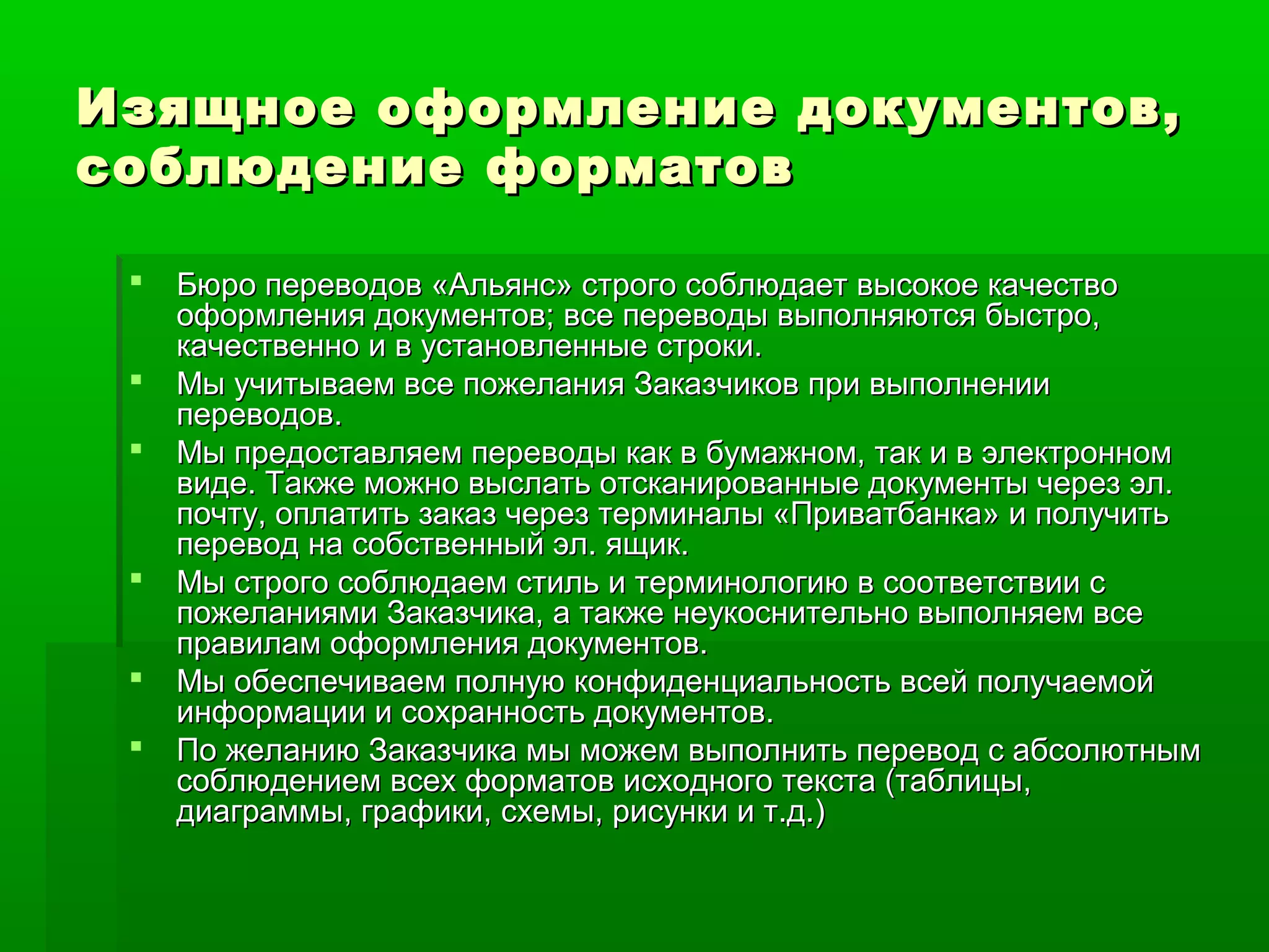 Бюро переводов 'Альянс' предлагает высококачественные услуги перевода, уделяя внимание оформлению документов согласно установленным стандартам. Они обеспечивают конфиденциальность, соблюдают стиль и терминологию по запросу клиентов, а также предоставляют переводы в бумажном и электронном виде. Команда состоит из высококвалифицированных специалистов, которые гарантируют своевременное выполнение заказов и высокое качество работы.