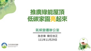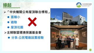此文档介绍了推动绿色屋顶和低碳家庭的计划,包括中央机关公有屋顶联合标租和太阳能板的安装。通过评估与合作,该计划预期在减少二氧化碳排放的同时,产生可观的电力和经济回馈。未来将探索更多潜在屋顶资源,以实现2050净零转型目标。