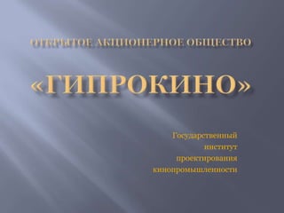 Государственный институт проектирования кинопромышленности, основанный в 30-х годах, стал высококвалифицированной организацией ОАО "Гипрокино", занимающейся проектированием объектов культуры, кинематографии и телевидения. Среди значимых проектов института - создание кино- и телестудий, а также объектов, связанных с информацией и культурой в разных странах. Сегодня "Гипрокино" продолжает развиваться, предлагая научные и проектные услуги, обеспечивая соответствие современным требованиям и стандартам.
