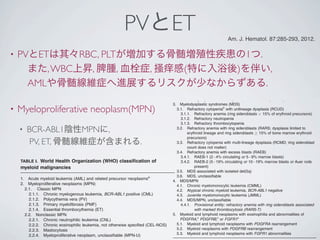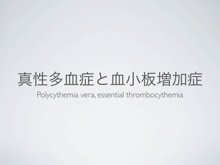 Polycythemia vera (PV) and essential thrombocythemia (ET) are types of myeloproliferative neoplasms characterized by increased red blood cells in PV and increased platelets in ET. Both can involve increased white blood cells and risk of thrombosis, spleen enlargement, itching, and progression to acute myeloid leukemia or myelofibrosis. PV and ET involve an acquired abnormal clone with mutations in genes like JAK2 and MPL. The document discusses diagnostic criteria and distinguishing PV and ET from secondary causes of increased red blood cells or platelets. Bone marrow testing is often not required if criteria are met.