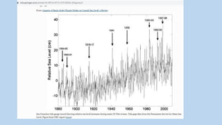 long-term trend of slowly rising sea level (red line), and the occurrence of atmospheric