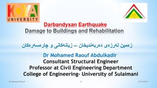 The document discusses earthquake-resistant building design and rehabilitation methods, focusing on factors that influence structural damage and ideal qualities of resilient buildings. It outlines techniques for strengthening existing structures, such as crack treatment, external surface treatments, and confinement techniques. Recommendations for housing construction in Kurdistan emphasize the importance of robust foundations, symmetrical planning, and the use of reinforced masonry.