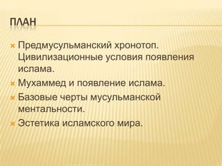 Документ описывает основы формирования исламского мира, включая предмусульманский контекст, личность Мухаммеда и основные характеристики мусульманской ментальности. В нем рассмотрены исторические, культурные и религиозные аспекты, а также развитие исламского искусства и архитектуры. Также подчеркиваются основные принципы ислама и сравнение его с иудаизмом и христианством.