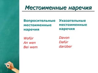 Документ содержит информацию о местоименных наречиях в немецком языке, включая их виды и использование в вопросительных предложениях. Обсуждаются вопросительные и указательные местоименные наречия, их формирование и примеры использования с различными предлогами. Также подчеркивается важность правильного падежного управления при формулировании вопросов.