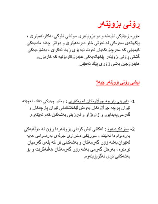 و سوتانی ری به ناوكی كارئه ، هێنرێ پێكهاته سه ی ره له كی نه ده خاو وتی رئه چه دواتر و هێنرێ ماده ند یه كی كه كیمیایی سه رچاوه كه نه یان نیه وت ئه زیاد بۆی به ، كرێ شێوه یه كی بزوێنه ڕۆنی گشتی پێكهاته ر یه هایدرۆكاربۆنیه كی كه و كاربۆن به هایدرۆجین ئه پێك زۆری شی .هێنن ئیشیڕۆنیبزوێنه رچیه ؟ 1 - پارچه دابڕینی جواڵوه له كان یه كتری : وه ته چینێكی كو ئه نك چێته پارچه نێوان جواڵوه به كان وه پارچه نێوان لێكخشاندنی ش و كان گه په رمی ژاوه و یدابوو له و ژاو به رزینی شه كه كان ئه م بێته وه . 2 - ساردكردنه وه له : كاتی بزوێنه كردنی ئیش له ڕۆن ردا جوڵه یه كی به رده ئه دا وام جوڵه داخراوی سوڕێكی ، بێت به ی رده هه وامی یه له به نێوان شه گه زۆر رمه به و كان شه كه تر كانی پله گه ی رمیان نزمتره به ، وه گه ش به رمی شه گه زۆر رمه هه كان ڵئه بۆ و گرێت به شه ئه تری كانی گوێز ێته وه .