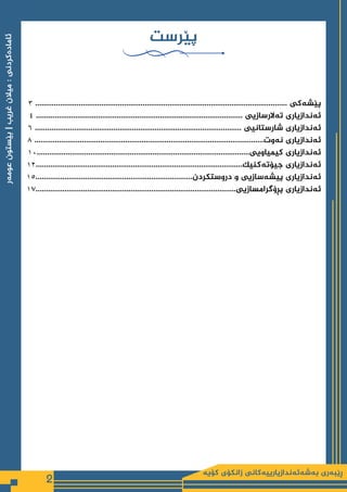 ڕێبەری 2 عومەر بێستون | غریب میالن : ئامادەكردنی پێرست 3 .......................................................................................................................... پێشەکی 4 .................................................................................................... تەالرسازیی ئەندازیاری 6 .................................................................................................... شارستانیی ئەندازیاری 8 ...............................................................................................................نەوت ئەندازیاری 10.......................................................................................................كیمیاویی ئەندازیاری 12....................................................................................................جیۆتەكنیك ئەندازیاری 15............................................................................دروستكردن و پیشەسازیی ئەندازیاری 17.................................................................................................پڕۆگرامسازیی ئەندازیاری