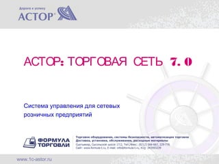Документ описывает ERP-систему 'Астор: Торговая сеть 7.0', предназначенную для автоматизации управления и учета в сетевых розничных предприятиях. Система включает многофункциональные модули для управления ассортиментом, ценами, запасами и продажами, а также предоставляет аналитические инструменты для поддержки маркетинга и взаимодействия с поставщиками. Разработка подразумевала использование современных технологий и методов управления, и система уже зарекомендовала себя в более чем 5000 магазинах.