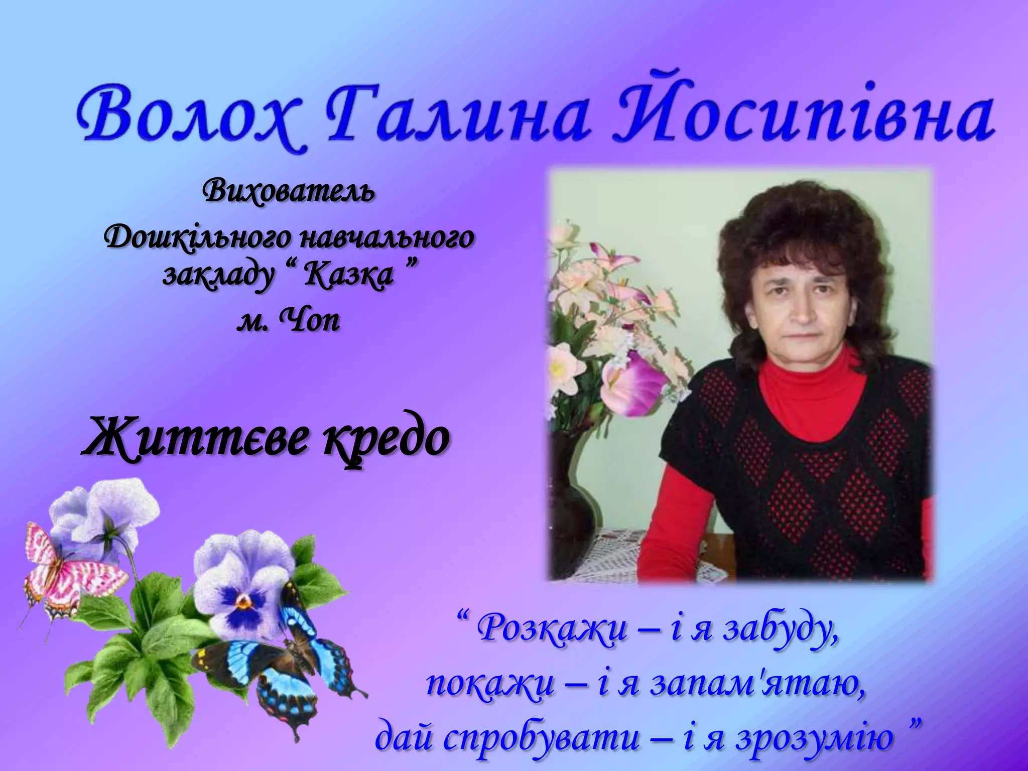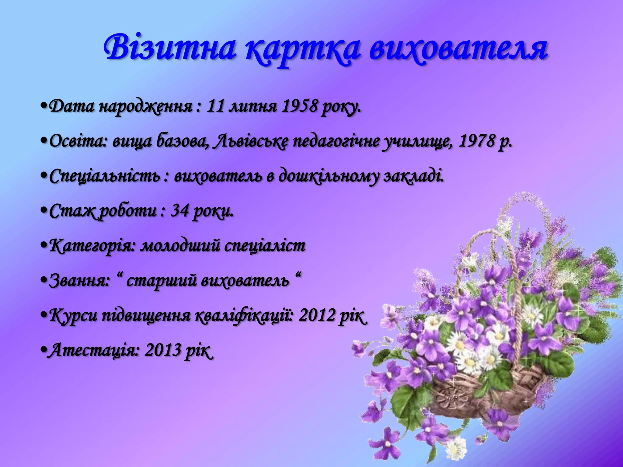 •Освіта: вища базова, Львівське педагогічне училище, 1978 р.