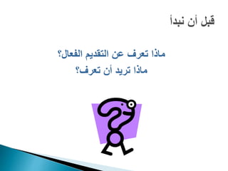 يتناول هذا الوثيقة مهارات إعداد وتقديم العروض، ويشمل خطوات التحضير والتسليم للمحتوى بشكل فعال. يُبرز أهمية تحليل الجمهور والإعداد المسبق لتقديم عرض ناجح مع التأكيد على عناصر مثل الهيكل، لغة الجسد، واستخدام الوسائل المساعدة. كما يقدم نصائح حول كيفية ختام العرض بشكل مؤثر لجذب انتباه الجمهور.