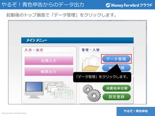 Inc. All Rights Reserved やるぞ!青色申告からのデータ出力 「仕訳データ出力」をクリックします。 「仕訳データ出力」をクリックします。 やるぞ!青色申告