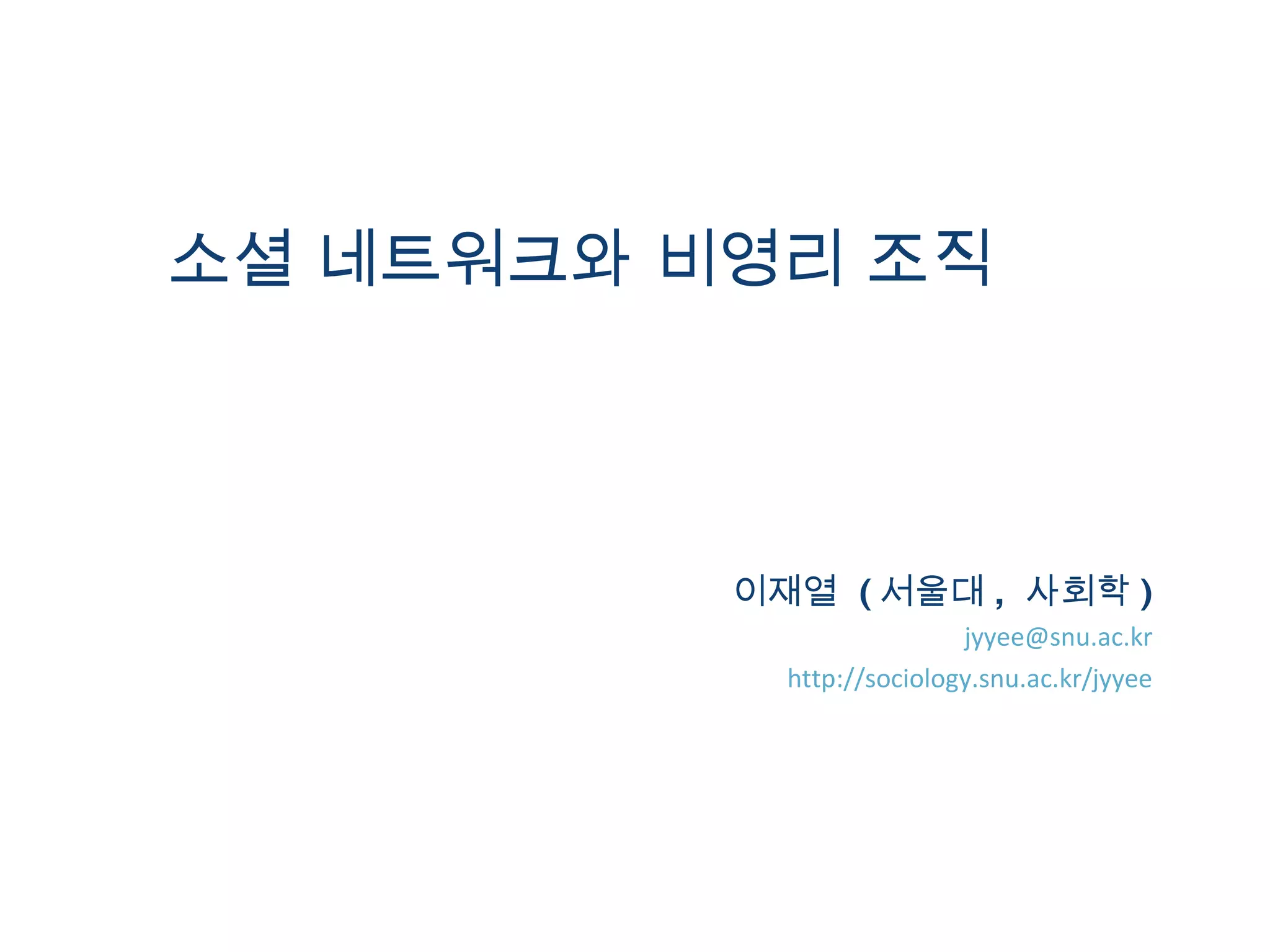 우리는 어디에 있나? Old Legacy: 연줄사회 마을공동체에서 연고형 사회로 학맥 ( 학통 ), 혈맥 ( 혈통 ), 지연 정보와 통제의 교환 , 동질성 기반 New Trend: 경계를 넘어서 세계 최고수준의 브로드밴드 보급률 온라인 커뮤니티의 확장 NGO 의 등장과 정치 / 문화의 변화 Mixture of two trends 환경특성의 변화 : 과거에 비해 훨씬 복잡하고 불안정한 환경 세계화 , 경쟁자의 급속한 진입과 탈퇴 , 예측할 수 없는 기술주기 정치환경의 유동성증가 전통적 관료제의 적응성 쇠퇴 거래비용의 감소 정보통신기술의 발전