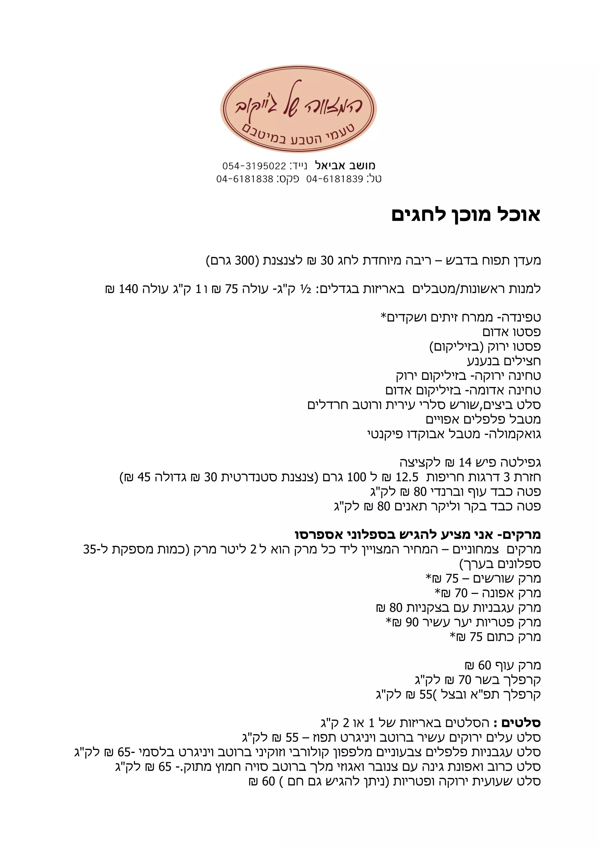 מיוחדת ריבה – בדבש תפוח מעדן30) לצנצנת ₪300(גרם עולה -ק"ג ½ :בגדלים באריזות ראשונות/מטבלים למנות75ו ₪1עולה ק"ג140₪ *ושקדים זיתים ממרח -טפינדה אדום פסטו ()בזיליקום ירוק פסטו בנענע חצילים ירוק בזיליקום -ירוקה טחינה אדום בזיליקום -אדומה טחינה חרדלים ורוטב עירית סלרי ביצים,שורש סלט אפויים פלפלים מטבל פיקנטי אבוקדו מטבל -גואקמולה פיש גפילטה14לקציצה ₪ חזרת3חריפות דרגות12.5ל ₪100סטנדרטית )צנצנת גרם30גדולה ₪45(₪ וברנדי עוף כבד פטה80לק"ג ₪ תאנים וליקר בקר כבד פטה80לק"ג ₪ אספרסו בספלוני להגיש מציע אני -מרקים ל הוא מרק כל ליד המצויין המחיר – צמחוניים מרקים2-ל מספקת )כמות מרק ליטר35 (בערך ספלונים – שורשים מרק75*₪ – אפונה מרק70*₪ בצקניות עם עגבניות מרק80₪ עשיר יער פטריות מרק90*₪ כתום מרק75*₪ עוף מרק60₪ בשר קרפלך70לק"ג ₪ ( ובצל תפ"א קרפלך55לק"ג ₪ : סלטיםשל באריזות הסלטים1או2ק"ג – תפוז ויניגרט ברוטב עשיר ירוקים עלים סלט55לק"ג ₪ ברוטב וזוקיני קולורבי מלפפון צבעוניים פלפלים עגבניות סלט- בלסמי ויניגרט65לק"ג ₪ -.מתוק חמוץ סויה ברוטב מלך ואגוזי צנובר עם גינה ואפונת כרוב סלט65לק"ג ₪ ( חם גם להגיש )ניתן ופטריות ירוקה שעועית סלט60₪