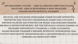Лев Николаевич Толстой — выдающийся русский писатель, оказавший значительное влияние на мировую литературу и гуманизм. Его жизнь и творчество охватывают широкий спектр тем, включая реализм и философию, с известными произведениями, такими как 'Война и мир' и 'Анна Каренина'. Толстой умер 7 ноября 1910 года, оставив за собой богатое литературное наследие, которое продолжает изучаться и цениться.