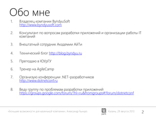 Документ, подготовленный Александром Бындю, охватывает возможности и вызовы, стоящие перед малым бизнесом в IT-секторе, акцентируя внимание на человеческом факторе и методологиях разработки. Автор делится своими личными историями и предложениями для старта, включая значение гибкости и эффективного управления. Также обсуждаются управленческие фреймворки, такие как Scrum и Kanban, как важные инструменты для успешной работы компаний.