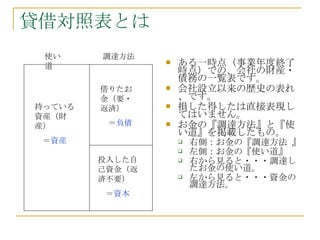 貸借対照表とは ある一時点(事業年度終了時点)での、会社の財産・債務の一覧表です。会社設立以来の歴史の表れ、です。 損した得したは直接表現してはいません。 お金の『調達方法』と『使い道』を掲載したもの。 右側:お金の『調達方法 』 左側:お金の『使い道』 右から見ると・・・調達したお金の使い道。 左から見ると・・・資金の調達方法。 持っている資産(財産) = 資産 借りたお金(要・返済) = 負債 投入した自己資金(返済不要) = 資本 使い道 調達方法 - 3.