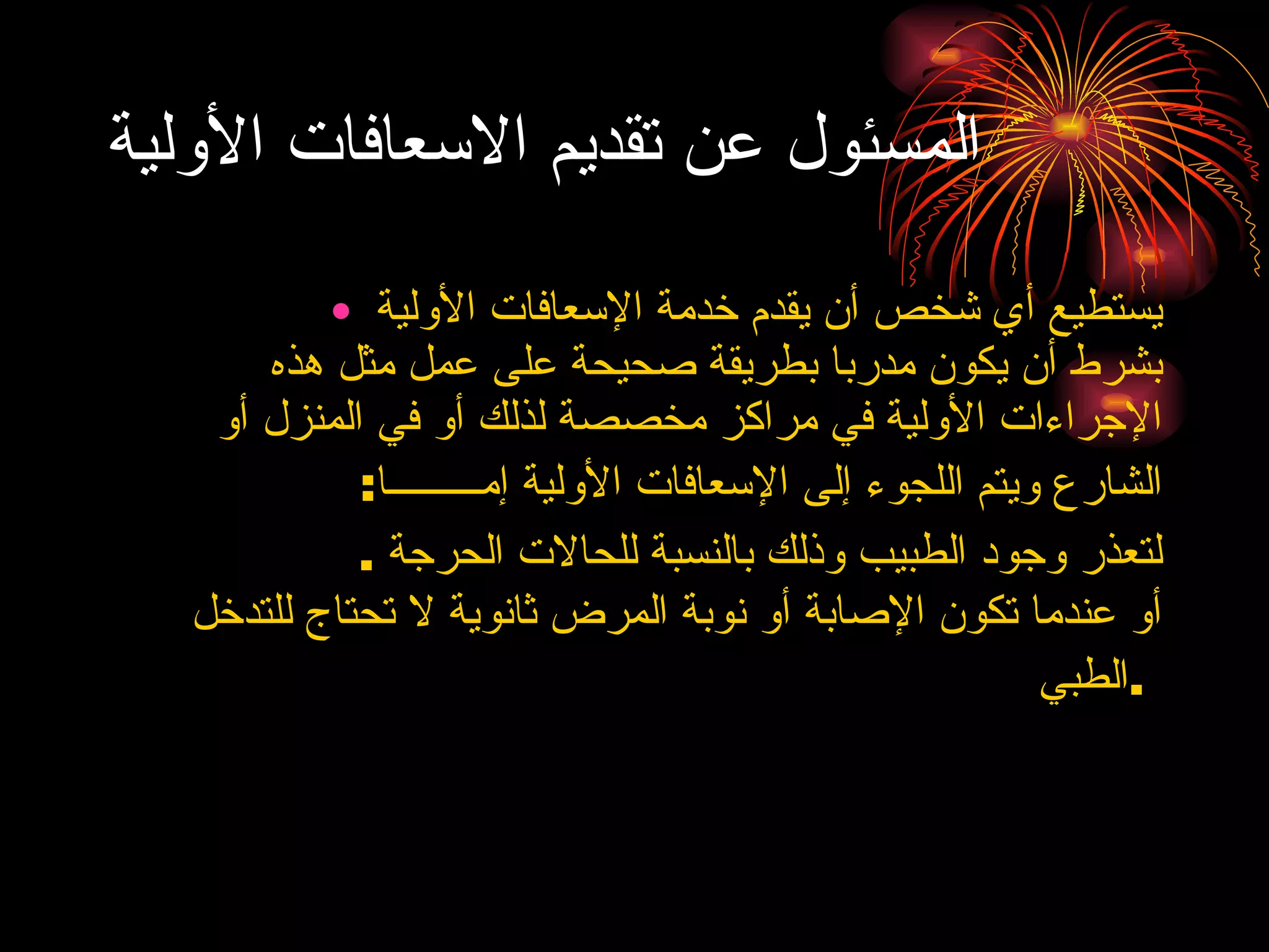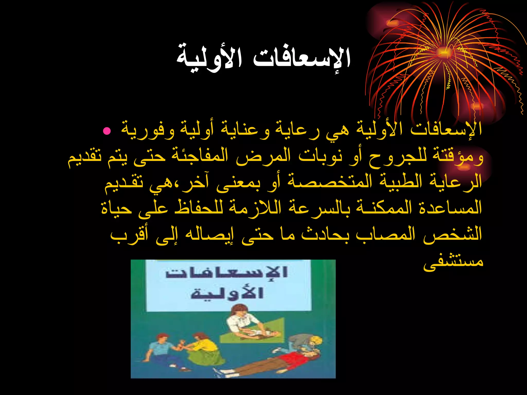 الإسعافات الأولية هي الرعاية الأولية الفورية للجروح والنوبات المرضية حتى تقديم الرعاية الطبية المتخصصة. يمكن لأي شخص مدرب على الإسعافات الأولية تقديم المساعدة في الحالات الحرجة أو الثانوية، وتهدف إلى الحفاظ على الحياة وتقليل المضاعفات. تشمل الإسعافات الأولية تقييم الحالات، التعامل مع الكسور والحروق، وتوفير حماية للمسعف من الأمراض.