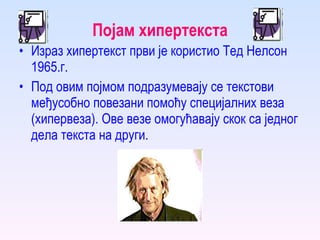 Појам хипертекста Изразхипертекст први је користио Тед Нелсон 1965.г. Под овим појмом подразумевају се текстови међусобно повезани помоћу специјалних веза (хипервеза). Ове везе омогућавају скок са једног дела текста на други.