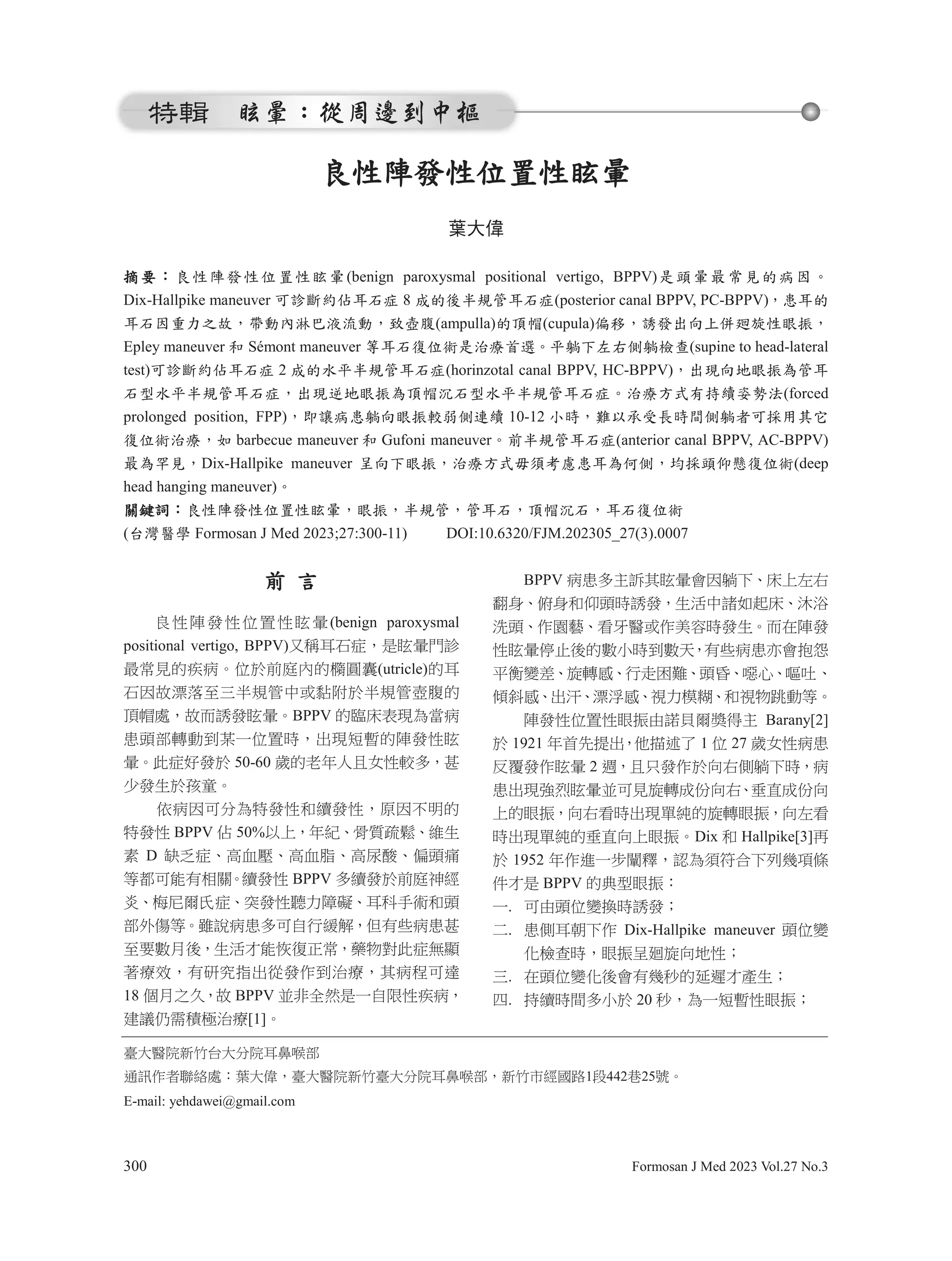 This document summarizes benign paroxysmal positional vertigo (BPPV), a common cause of positional vertigo. It describes the pathophysiology of BPPV, involving debris accumulating in the posterior or horizontal semicircular canals, causing vertigo when the head is moved into certain positions. It outlines diagnostic tests like the Dix-Hallpike maneuver and treatments including the Epley maneuver and particle repositioning maneuvers, which aim to move the debris out of the affected canal.
