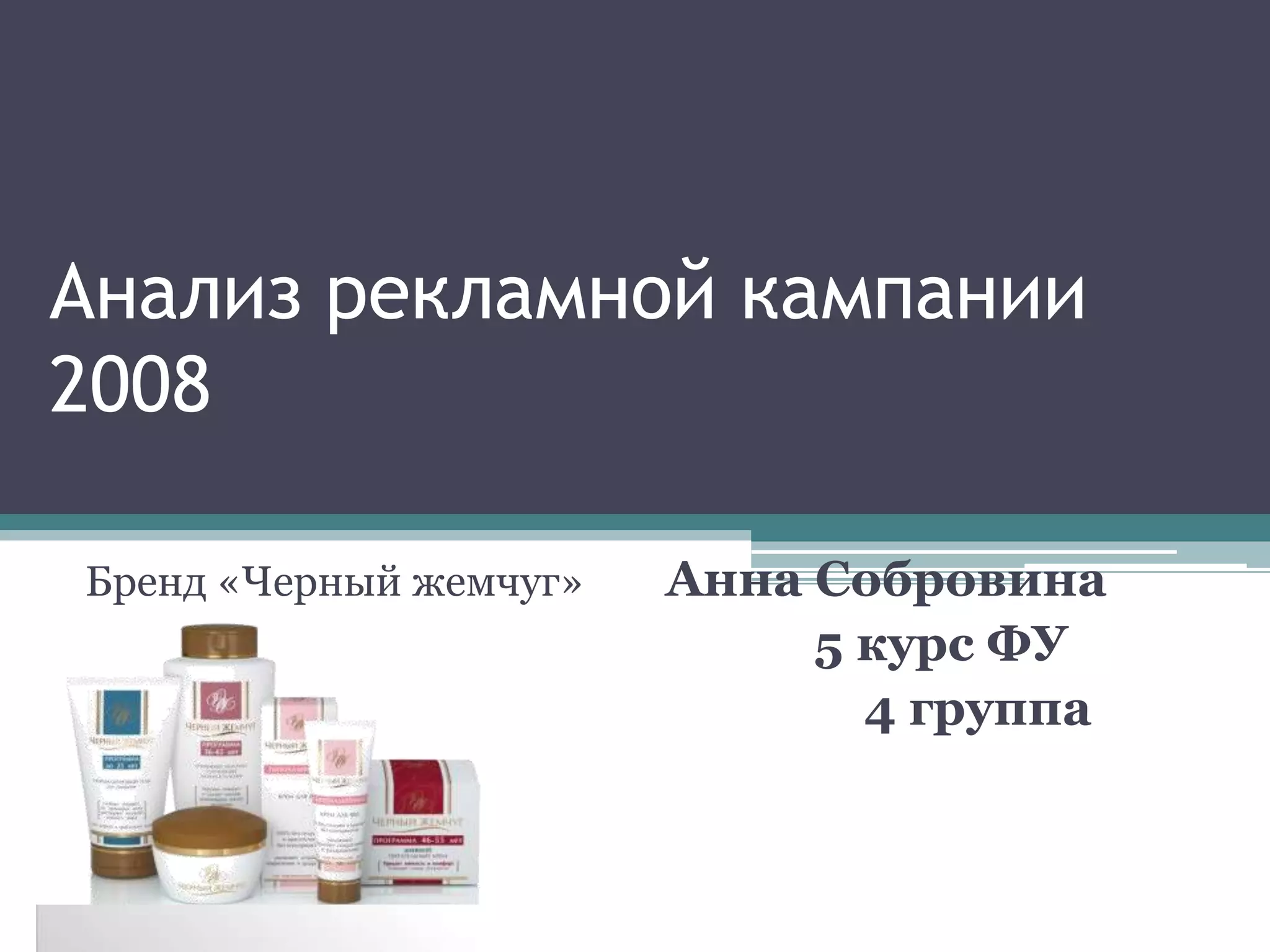Документ представляет анализ рекламной кампании бренда «черный жемчуг» в 2008 году, подчеркивая важность сезонности затрат и активность в различных медиа. Основное внимание уделяется телевизионной рекламе, которая составляет 97% рекламных затрат, с акцентом на использование звезд для продвижения продуктов, ориентированных на разные возрастные группы. В заключение, подчеркивается, что бренд успешно выстраивает коммуникацию с женской аудиторией, адаптируя свои сообщения в зависимости от возрастных сегментов.